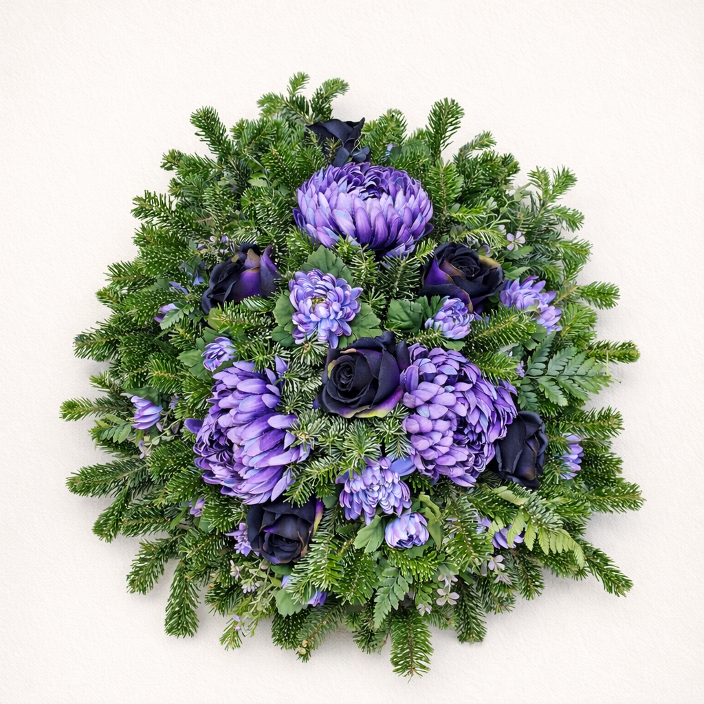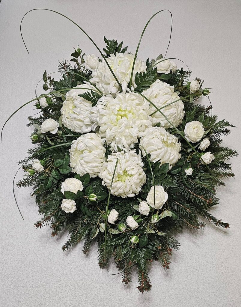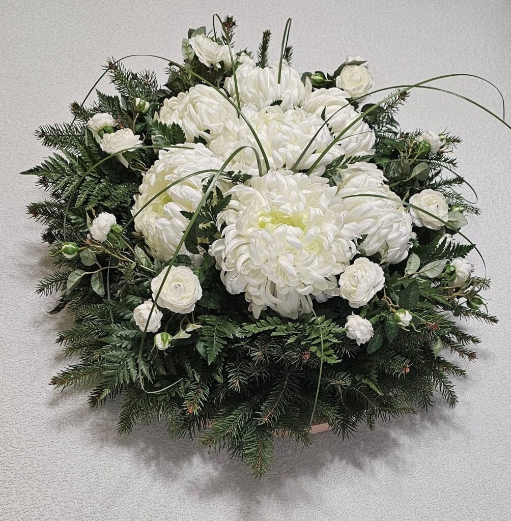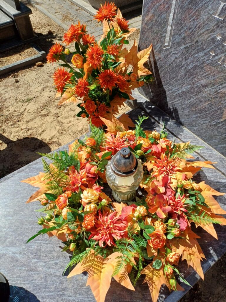 Dekoracja nagrobna wykonana na bazie naturalnego wiklinowego wianka w kolorze czekoladowego brązu o średnicy 50 cm. Kompozycję tworzą wysokiej jakości kwiaty oraz starannie dobrane, trwałe dodatki, które nadają całości harmonijny i ponadczasowy charakter. Całkowita średnica wianka wraz z dekoracją wynosi około 65–70 cm, dzięki czemu stanowi wyrazisty i estetyczny akcent nagrobka.