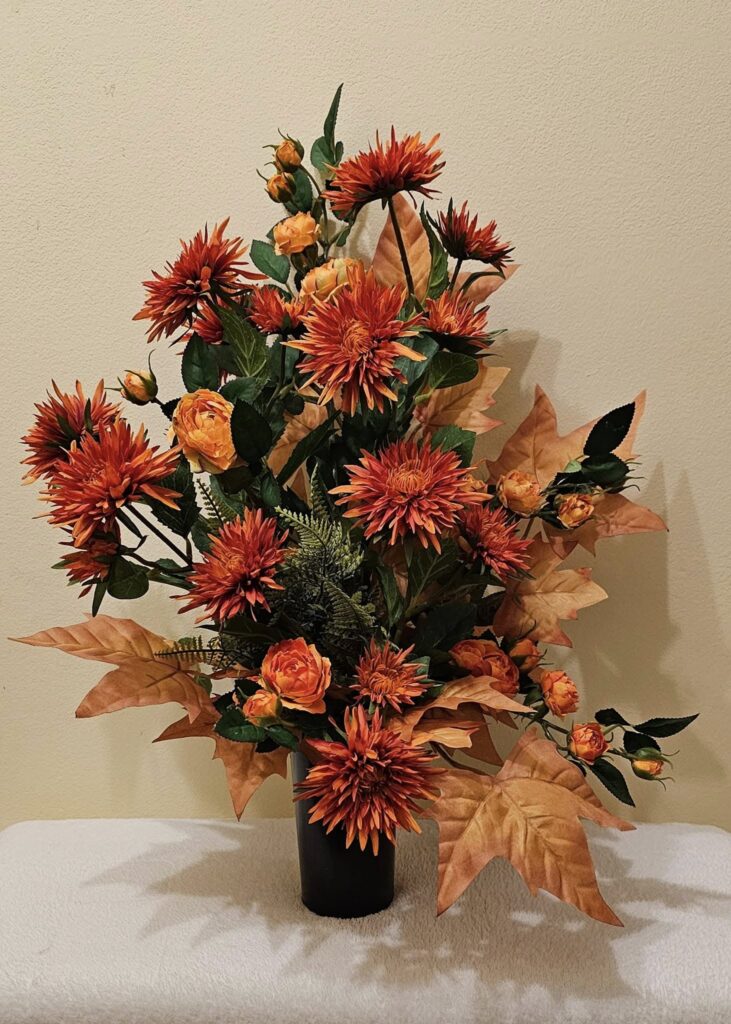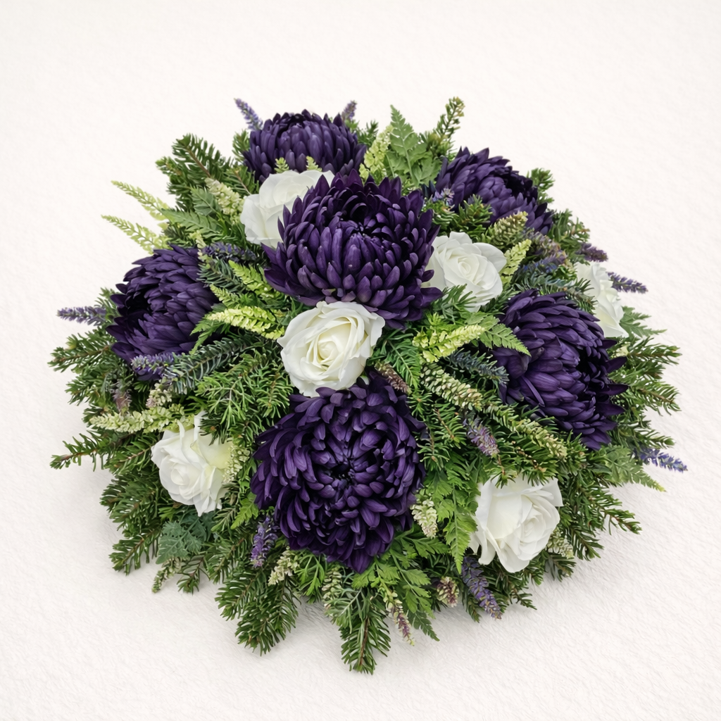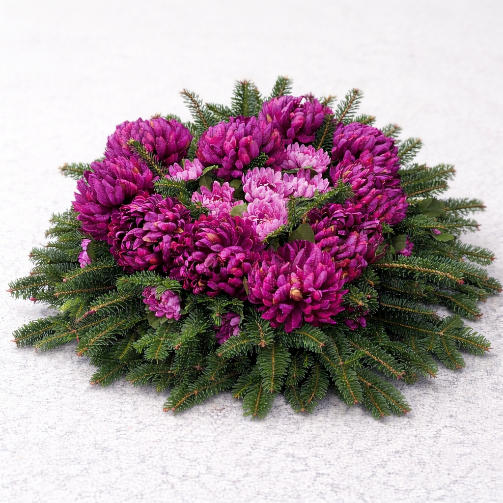 Dekoracja nagrobna wykonana na bazie naturalnego wiklinowego wianka w kolorze czekoladowego brązu o średnicy 50 cm. Kompozycję tworzą wysokiej jakości kwiaty oraz starannie dobrane, trwałe dodatki, które nadają całości harmonijny i ponadczasowy charakter. Całkowita średnica wianka wraz z dekoracją wynosi około 65–70 cm, dzięki czemu stanowi wyrazisty i estetyczny akcent nagrobka.