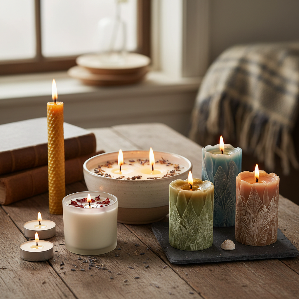 • Świece zalewane – kompozycje zamknięte w starannie dobranych naczyniach: szkle, ceramice lub eleganckich formach, tworzące dopracowaną całość estetyczną.