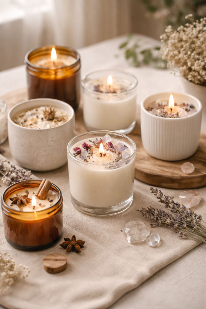 - świece zapachowe – z autorskimi kompozycjami aromatycznymi